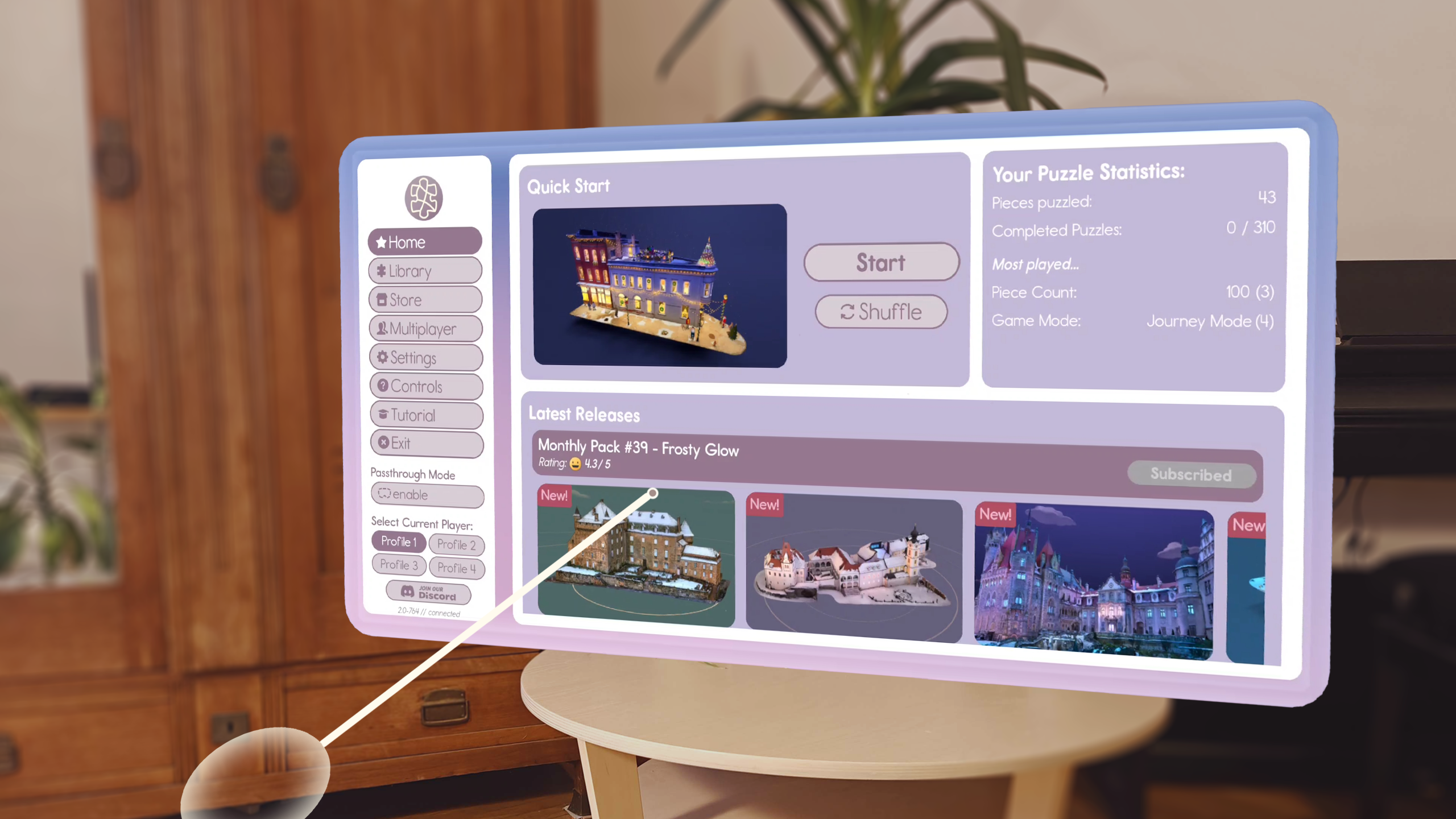 That’s not all! We’ve introduced a big set of enhancements to hand tracking. Grabbing and releasing is more responsive and reliable, puzzle interactions are clearer thanks to fingertip cues, and tiny details are easier than ever to interact with thanks to improved poke gestures (yes, you can still pet the cats). We’ve also added a throw-back gesture to return pieces to the wall, drag gestures to switch tabs, and full hand-tracking tutorials across all modes. Everything has been refined so puzzling with your hands feels more natural, more fluid, and more fun.